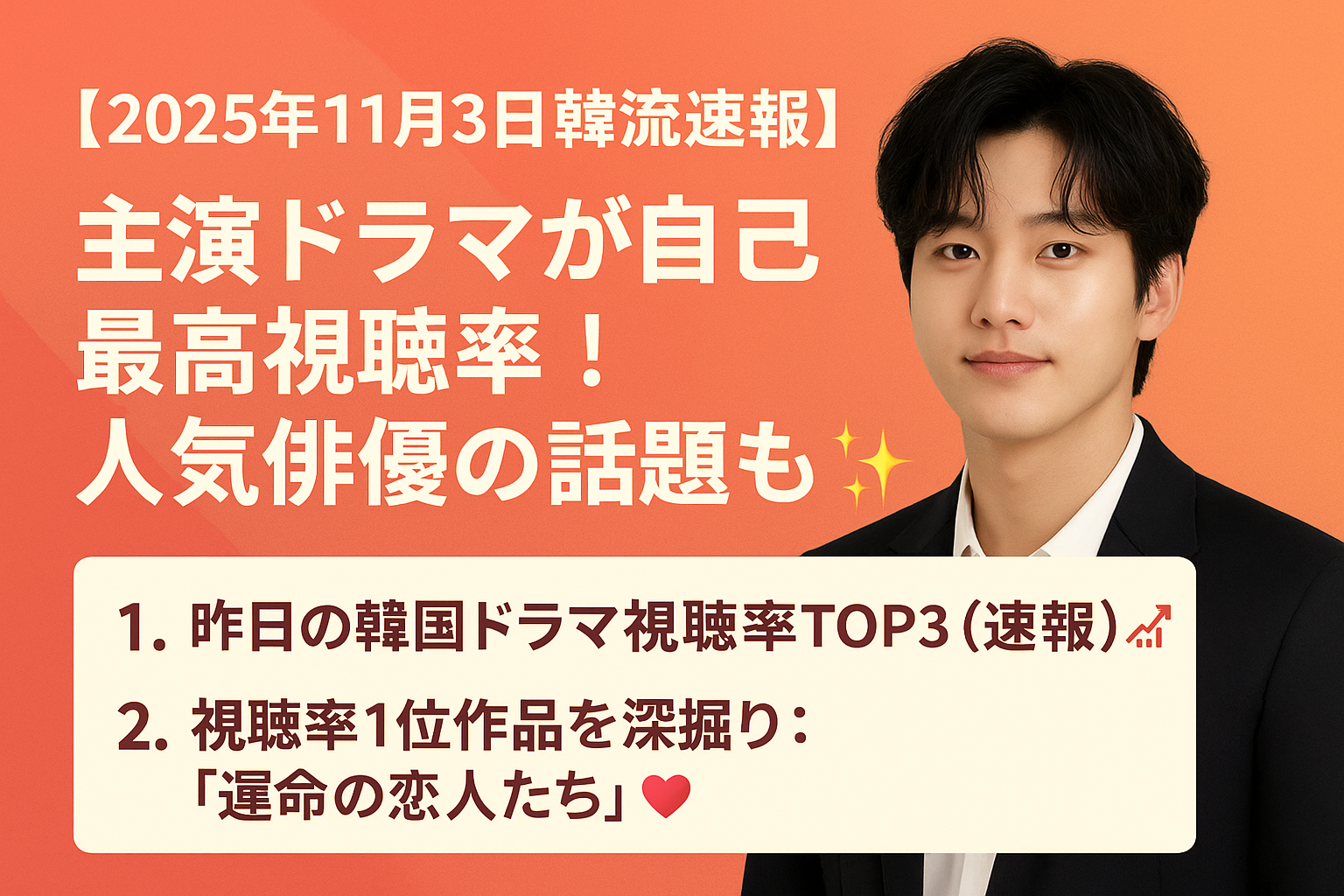 今日の韓国 芸能ニュース 速報の要点は、やはり『運命の恋人たち』の**自己最高視聴率更新**です。