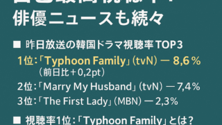 2025年10月24日|韓国ドラマ 視聴率 最新・韓国 芸能ニュース 速報。『Typhoon Family』が自己最高更新ペースで上昇中。最新の視聴率動向、SNSトレンド、俳優ニュースを時系列でチェック。